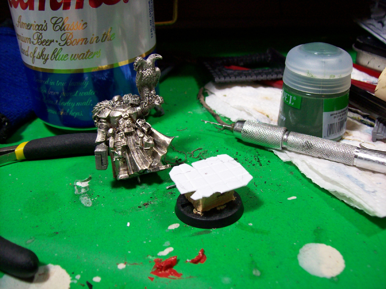 I also managed to build a Rune Preist. I was trying to capture him in the middle of calling up the haws of the world wolf. What I got was a 10 foot man gently singing to the birds...Maybe he's yelling but after I took this photo I used a different head and angled it downwards a bit. That's the start of a Sanguinary Priest on his left.